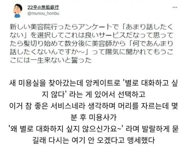 미용실에 별로 대화하고 싶지 않다라는 앙케이트가 있었다 작성자 정보 데굴데굴쪽지보내기 자기소개 아이디로 검색 전체게시물쪽지보내기 자기소개 아이디로 검색 전체게시물 작성 작성일 2025.12.10 23:46 컨텐츠 정보 6 조회 1 댓글 목록 본문 게시판 활동이 적극적이고 지속적이면 레벨업 됩니다. [펌] SNS 공유 신고 데굴데굴쪽지보내기 자기소개 아이디로 검색 전체게시물쪽지보내기 자기소개 아이디로 검색 전체게시물 레벨 72 99% 등록일 12.10 미용실에 별로 대화하고 싶지 않다라는 앙케이트가 있었다 댓글 1 등록일 12.10 일에 찌든 노동청 감독관 댓글 1 등록일 12.10 나이들수록 공감되는 문장 댓글 1 등록일 12.10 쇼핑백 디자인 1티어? 댓글 1 관련자료 댓글 1 데굴데굴님의 댓글 데굴데굴쪽지보내기 자기소개 아이디로 검색 전체게시물쪽지보내기 자기소개 아이디로 검색 전체게시물 작성일 12.10 23:47 정말... 다시는 가고 싶지 않았겠네..^^;;; 신고 정말... 다시는 가고 싶지 않았겠네..^^;;; 로그인한 회원만 댓글 등록이 가능합니다. 목록