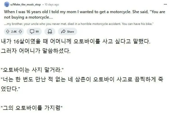 데굴데굴님의 댓글 데굴데굴쪽지보내기 자기소개 아이디로 검색 전체게시물쪽지보내기 자기소개 아이디로 검색 전체게시물 작성일 12.11 23:29 말 한마디로 오토바이를 타지 않게 됐었겠네요...저 얘기를 듣고 어떡해 타겠어.. 신고 말 한마디로 오토바이를 타지 않게 됐었겠네요...저 얘기를 듣고 어떡해 타겠어..