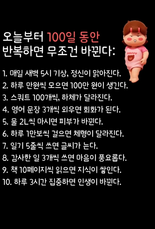 오늘의 작은 선택이 미래의 나를 만듭니다. 작성자 정보 승승장구쪽지보내기 자기소개 아이디로 검색 전체게시물쪽지보내기 자기소개 아이디로 검색 전체게시물 작성 작성일 2025.12.12 09:48 컨텐츠 정보 7 조회 1 댓글 목록 본문 게시판 활동이 적극적이고 지속적이면 레벨업 됩니다. SNS 공유 신고 승승장구쪽지보내기 자기소개 아이디로 검색 전체게시물쪽지보내기 자기소개 아이디로 검색 전체게시물 레벨 72 98% 등록일 09:49 증상별 아플 때 먹으면 좋은 차! 댓글 1 등록일 09:48 다른 점 3개 찾기 댓글 1 등록일 09:48 오늘의 작은 선택이 미래의 나를 만듭니다. 댓글 1 등록일 00:36 출석! 관련자료 댓글 1 발야구님의 댓글 발야구쪽지보내기 자기소개 아이디로 검색 전체게시물쪽지보내기 자기소개 아이디로 검색 전체게시물 작성일 10:01 아는데 실천이 문제여~~ 신고 아는데 실천이 문제여~~ 로그인한 회원만 댓글 등록이 가능합니다. 목록