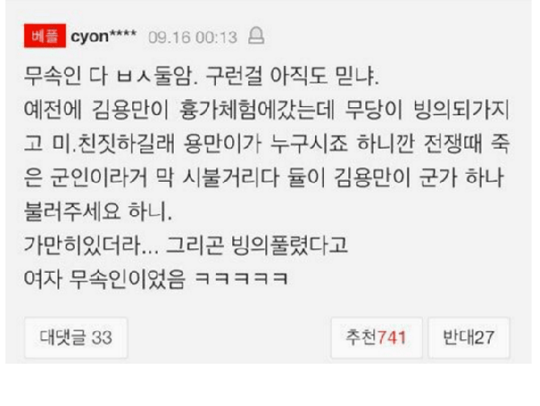 데굴데굴님의 댓글 데굴데굴쪽지보내기 자기소개 아이디로 검색 전체게시물쪽지보내기 자기소개 아이디로 검색 전체게시물 작성일 12.12 23:29 군대를 안간 무당이니...군가를 알리가...^^;;; 신고 군대를 안간 무당이니...군가를 알리가...^^;;;