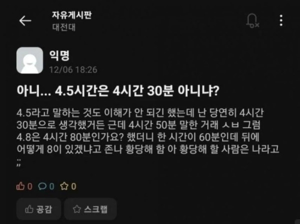 4.5시간은 4시간 30분 아니냐? 작성자 정보 아몰랑쪽지보내기 자기소개 아이디로 검색 전체게시물쪽지보내기 자기소개 아이디로 검색 전체게시물 작성 작성일 2025.12.13 16:25 컨텐츠 정보 52 조회 2 댓글 목록 본문 게시판 활동이 적극적이고 지속적이면 레벨업 됩니다.<펌> SNS 공유 신고 아몰랑쪽지보내기 자기소개 아이디로 검색 전체게시물쪽지보내기 자기소개 아이디로 검색 전체게시물 레벨 79 99% 등록일 12.13 정신나간 챗GPT 댓글 2 등록일 12.13 가게사장이 물건주문을 자꾸만 까먹어서 못 참았던 알바생 등록일 12.13 4.5시간은 4시간 30분 아니냐? 댓글 2 등록일 12.13 외국 약병 구매 후기 댓글 2 관련자료 댓글 2 아몰랑님의 댓글 아몰랑쪽지보내기 자기소개 아이디로 검색 전체게시물쪽지보내기 자기소개 아이디로 검색 전체게시물 작성일 12.13 16:26 아니 4.5시간은 4시간 30분이 맞징 신고 아니 4.5시간은 4시간 30분이 맞징{emo:onion-011.gif:50} 발야구님의 댓글 발야구쪽지보내기 자기소개 아이디로 검색 전체게시물쪽지보내기 자기소개 아이디로 검색 전체게시물 작성일 12.13 17:00 4.5시간은 4시간 30분 맞으니 걱정 마세요~~ 신고 4.5시간은 4시간 30분 맞으니 걱정 마세요~~ 로그인한 회원만 댓글 등록이 가능합니다. 목록