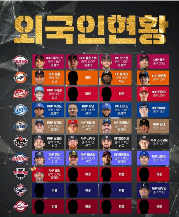 2026시즌 KBO리그 외국인 선수들을 정리했습니다 작성자 정보 승승장구쪽지보내기 자기소개 아이디로 검색 전체게시물쪽지보내기 자기소개 아이디로 검색 전체게시물 작성 작성일 2025.12.14 02:15 컨텐츠 정보 6 조회 목록 본문 게시판 활동이 적극적이고 지속적이면 레벨업 됩니다. SNS 공유 신고 승승장구쪽지보내기 자기소개 아이디로 검색 전체게시물쪽지보내기 자기소개 아이디로 검색 전체게시물 레벨 83 97% 등록일 02:20 MLB 야구 참조 지도가 여기에 있습니다! 등록일 02:18 지금 나에게 초능력이 생긴다면? 등록일 02:15 2026시즌 KBO리그 외국인 선수들을 정리했습니다 등록일 02:02 월드시리즈의 역사를 바꾼 LA 다저스 야마모토 요시노부가 ‘2026 월드베이스볼클래식’에 참가합니다. 관련자료 댓글 0 등록된 댓글이 없습니다. 로그인한 회원만 댓글 등록이 가능합니다. 목록
