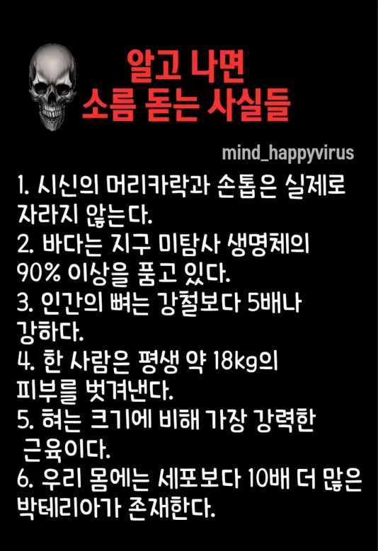 알고 나면 소름 돋는 사실들☠️ 작성자 정보 승승장구쪽지보내기 자기소개 아이디로 검색 전체게시물쪽지보내기 자기소개 아이디로 검색 전체게시물 작성 작성일 2025.12.14 16:10 컨텐츠 정보 21 조회 1 댓글 목록 본문 게시판 활동이 적극적이고 지속적이면 레벨업 됩니다. SNS 공유 신고 승승장구쪽지보내기 자기소개 아이디로 검색 전체게시물쪽지보내기 자기소개 아이디로 검색 전체게시물 레벨 87 98% 등록일 22:53 스트레스 체크! 지금 내 상태는? 등록일 22:51 여드름, 부위마다 원인이 다르다? 단순 피부 문제가 아닐 수 있어요! 등록일 22:46 10초 안에 숨어 있는 고양이 찾기 등록일 22:45 오늘의 기분에 오늘의 차를 골라보세요. 관련자료 댓글 1 발야구님의 댓글 발야구쪽지보내기 자기소개 아이디로 검색 전체게시물쪽지보내기 자기소개 아이디로 검색 전체게시물 작성일 16:49 정말 그럴것 같네요~~ 신고 정말 그럴것 같네요~~ 로그인한 회원만 댓글 등록이 가능합니다. 목록