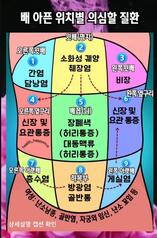 배꼽 주위가 아프다가 오른쪽 아래로 내려옴)
