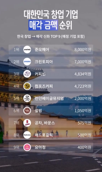 한국 창업→매각 신화 TOP 9 작성자 정보 승승장구쪽지보내기 자기소개 아이디로 검색 전체게시물쪽지보내기 자기소개 아이디로 검색 전체게시물 작성 작성일 2025.12.15 22:33 컨텐츠 정보 6 조회 목록 본문 게시판 활동이 적극적이고 지속적이면 레벨업 됩니다. SNS 공유 신고 승승장구쪽지보내기 자기소개 아이디로 검색 전체게시물쪽지보내기 자기소개 아이디로 검색 전체게시물 레벨 93 98% 등록일 12.15 유럽 5대 리그 TOP 10 구단을 경제적 관점에서 완전 분석했습니다. 등록일 12.15 세계에서 가장 돈이 많은 배우는? 등록일 12.15 각국을 대표하는 최고 스타 15명 등록일 12.15 스포츠 종목별 세계 챔피언 국가는? 관련자료 댓글 0 등록된 댓글이 없습니다. 로그인한 회원만 댓글 등록이 가능합니다. 목록