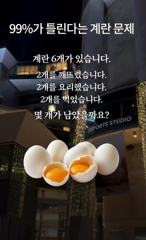 99%가 틀리는 계란 문제 작성자 정보 승승장구쪽지보내기 자기소개 아이디로 검색 전체게시물쪽지보내기 자기소개 아이디로 검색 전체게시물 작성 작성일 2025.12.15 22:35 컨텐츠 정보 6 조회 목록 본문 게시판 활동이 적극적이고 지속적이면 레벨업 됩니다. SNS 공유 신고 승승장구쪽지보내기 자기소개 아이디로 검색 전체게시물쪽지보내기 자기소개 아이디로 검색 전체게시물 레벨 93 98% 등록일 12.15 유럽 5대 리그 TOP 10 구단을 경제적 관점에서 완전 분석했습니다. 등록일 12.15 세계에서 가장 돈이 많은 배우는? 등록일 12.15 각국을 대표하는 최고 스타 15명 등록일 12.15 스포츠 종목별 세계 챔피언 국가는? 관련자료 댓글 0 등록된 댓글이 없습니다. 로그인한 회원만 댓글 등록이 가능합니다. 목록