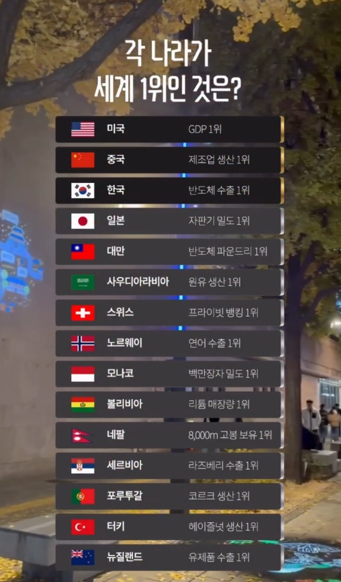 세계 각국이 1위를 차지한 분야를 경제적 관점에서 분석했습니다 작성자 정보 승승장구쪽지보내기 자기소개 아이디로 검색 전체게시물쪽지보내기 자기소개 아이디로 검색 전체게시물 작성 작성일 2025.12.15 22:39 컨텐츠 정보 6 조회 목록 본문 게시판 활동이 적극적이고 지속적이면 레벨업 됩니다. SNS 공유 신고 승승장구쪽지보내기 자기소개 아이디로 검색 전체게시물쪽지보내기 자기소개 아이디로 검색 전체게시물 레벨 93 98% 등록일 12.15 유럽 5대 리그 TOP 10 구단을 경제적 관점에서 완전 분석했습니다. 등록일 12.15 세계에서 가장 돈이 많은 배우는? 등록일 12.15 각국을 대표하는 최고 스타 15명 등록일 12.15 스포츠 종목별 세계 챔피언 국가는? 관련자료 댓글 0 등록된 댓글이 없습니다. 로그인한 회원만 댓글 등록이 가능합니다. 목록