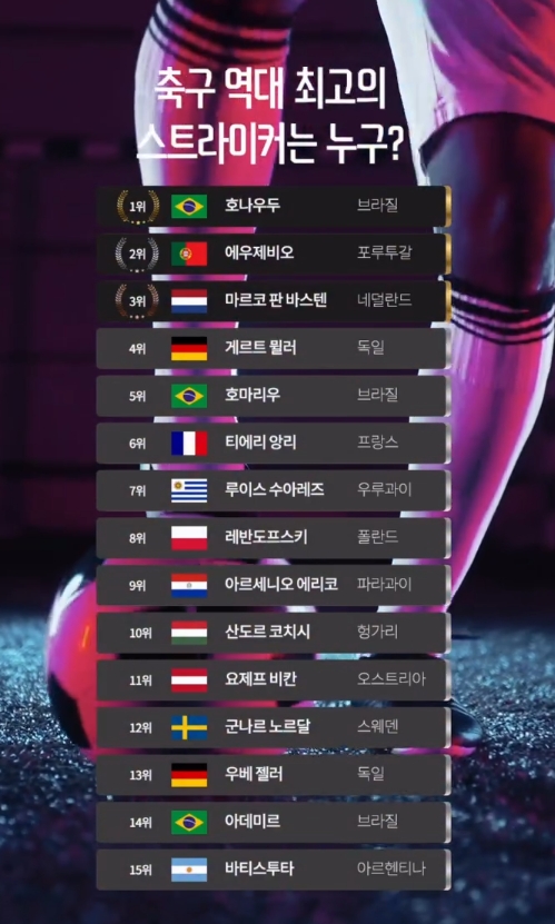 역대 최고 스트라이커 TOP 15 작성자 정보 승승장구쪽지보내기 자기소개 아이디로 검색 전체게시물쪽지보내기 자기소개 아이디로 검색 전체게시물 작성 작성일 2025.12.15 22:39 컨텐츠 정보 10 조회 목록 본문 게시판 활동이 적극적이고 지속적이면 레벨업 됩니다. SNS 공유 신고 승승장구쪽지보내기 자기소개 아이디로 검색 전체게시물쪽지보내기 자기소개 아이디로 검색 전체게시물 레벨 93 98% 등록일 12.15 유럽 5대 리그 TOP 10 구단을 경제적 관점에서 완전 분석했습니다. 등록일 12.15 세계에서 가장 돈이 많은 배우는? 등록일 12.15 각국을 대표하는 최고 스타 15명 등록일 12.15 스포츠 종목별 세계 챔피언 국가는? 관련자료 댓글 0 등록된 댓글이 없습니다. 로그인한 회원만 댓글 등록이 가능합니다. 목록
