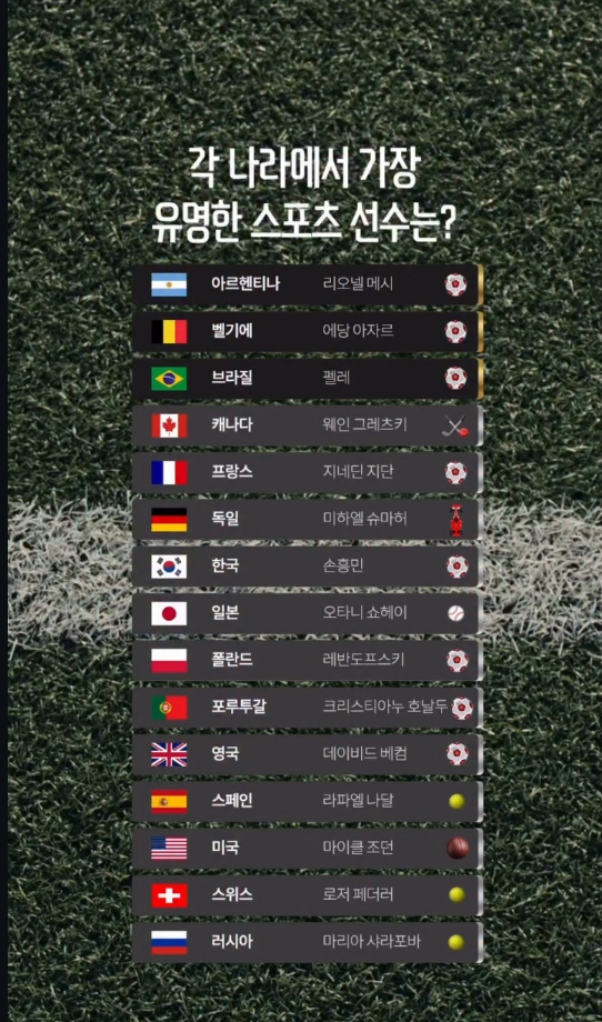 각국을 대표하는 최고 스타 15명 작성자 정보 승승장구쪽지보내기 자기소개 아이디로 검색 전체게시물쪽지보내기 자기소개 아이디로 검색 전체게시물 작성 작성일 2025.12.15 22:44 컨텐츠 정보 5 조회 목록 본문 게시판 활동이 적극적이고 지속적이면 레벨업 됩니다. SNS 공유 신고 승승장구쪽지보내기 자기소개 아이디로 검색 전체게시물쪽지보내기 자기소개 아이디로 검색 전체게시물 레벨 93 98% 등록일 12.15 유럽 5대 리그 TOP 10 구단을 경제적 관점에서 완전 분석했습니다. 등록일 12.15 세계에서 가장 돈이 많은 배우는? 등록일 12.15 각국을 대표하는 최고 스타 15명 등록일 12.15 스포츠 종목별 세계 챔피언 국가는? 관련자료 댓글 0 등록된 댓글이 없습니다. 로그인한 회원만 댓글 등록이 가능합니다. 목록