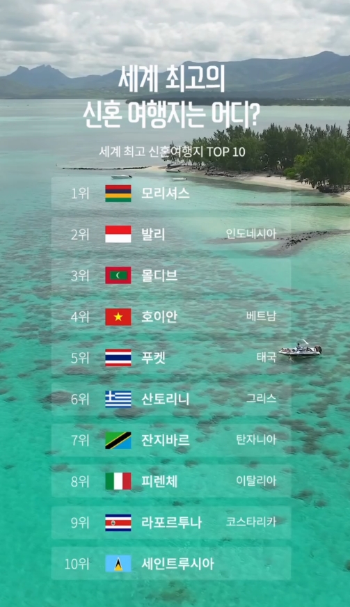 세계 최고의 신혼여행지는? 작성자 정보 승승장구쪽지보내기 자기소개 아이디로 검색 전체게시물쪽지보내기 자기소개 아이디로 검색 전체게시물 작성 작성일 2025.12.16 13:45 컨텐츠 정보 15 조회 1 댓글 목록 본문 게시판 활동이 적극적이고 지속적이면 레벨업 됩니다. SNS 공유 신고 승승장구쪽지보내기 자기소개 아이디로 검색 전체게시물쪽지보내기 자기소개 아이디로 검색 전체게시물 레벨 96 100% 등록일 13:56 세계 정상들의 키는 어떨까? 댓글 2 등록일 13:54 어느 나라 공군력이 강할까? 댓글 2 등록일 13:54 21세기 아시아 최고의 운동선수는 누구일까? 댓글 2 등록일 13:52 역대 최고의 축구 선수 이적료는 어떨까? 댓글 2 관련자료 댓글 1 앙마365님의 댓글 앙마365쪽지보내기 자기소개 아이디로 검색 전체게시물쪽지보내기 자기소개 아이디로 검색 전체게시물 작성일 14:29 나때는 몰디브였는디..ㅋㅋ 신고 나때는 몰디브였는디..ㅋㅋ 로그인한 회원만 댓글 등록이 가능합니다. 목록