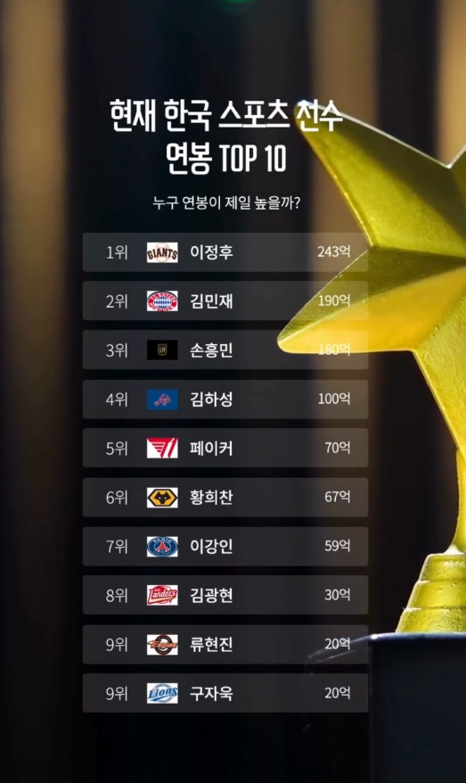 한국 스포츠 선수 연봉 1위는 누구? 작성자 정보 승승장구쪽지보내기 자기소개 아이디로 검색 전체게시물쪽지보내기 자기소개 아이디로 검색 전체게시물 작성 작성일 2025.12.16 13:46 컨텐츠 정보 17 조회 2 댓글 목록 본문 게시판 활동이 적극적이고 지속적이면 레벨업 됩니다. SNS 공유 신고 승승장구쪽지보내기 자기소개 아이디로 검색 전체게시물쪽지보내기 자기소개 아이디로 검색 전체게시물 레벨 96 100% 등록일 13:56 세계 정상들의 키는 어떨까? 댓글 2 등록일 13:54 어느 나라 공군력이 강할까? 댓글 2 등록일 13:54 21세기 아시아 최고의 운동선수는 누구일까? 댓글 2 등록일 13:52 역대 최고의 축구 선수 이적료는 어떨까? 댓글 2 관련자료 댓글 2 발야구님의 댓글 발야구쪽지보내기 자기소개 아이디로 검색 전체게시물쪽지보내기 자기소개 아이디로 검색 전체게시물 작성일 14:15 송흥민이 1위자리 내줬군~~ 신고 송흥민이 1위자리 내줬군~~ 앙마365님의 댓글 앙마365쪽지보내기 자기소개 아이디로 검색 전체게시물쪽지보내기 자기소개 아이디로 검색 전체게시물 작성일 14:29 정후야 내년엔 쫌 해보자~ 신고 정후야 내년엔 쫌 해보자~ 로그인한 회원만 댓글 등록이 가능합니다. 목록