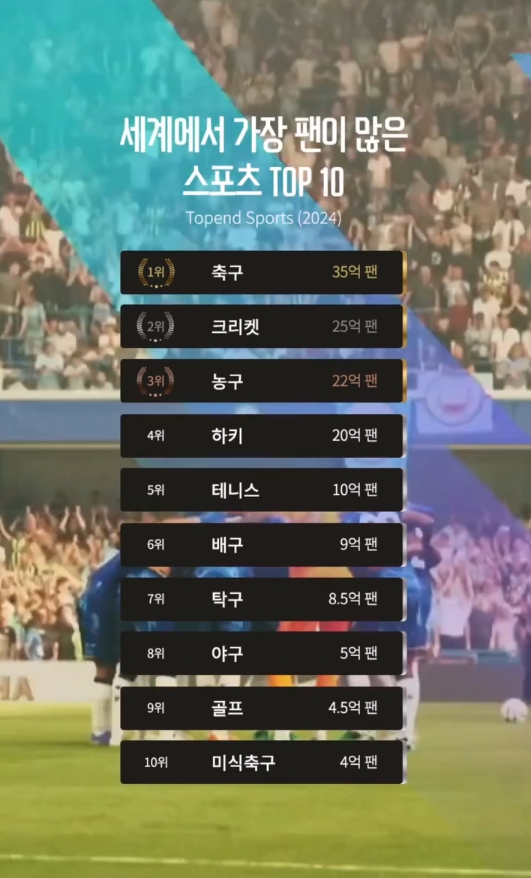 세계 가장 팬이 많은 스포츠 TOP 10 작성자 정보 승승장구쪽지보내기 자기소개 아이디로 검색 전체게시물쪽지보내기 자기소개 아이디로 검색 전체게시물 작성 작성일 2025.12.16 13:49 컨텐츠 정보 18 조회 2 댓글 목록 본문 게시판 활동이 적극적이고 지속적이면 레벨업 됩니다. SNS 공유 신고 승승장구쪽지보내기 자기소개 아이디로 검색 전체게시물쪽지보내기 자기소개 아이디로 검색 전체게시물 레벨 96 100% 등록일 13:56 세계 정상들의 키는 어떨까? 댓글 2 등록일 13:54 어느 나라 공군력이 강할까? 댓글 2 등록일 13:54 21세기 아시아 최고의 운동선수는 누구일까? 댓글 2 등록일 13:52 역대 최고의 축구 선수 이적료는 어떨까? 댓글 2 관련자료 댓글 2 앙마365님의 댓글 앙마365쪽지보내기 자기소개 아이디로 검색 전체게시물쪽지보내기 자기소개 아이디로 검색 전체게시물 작성일 14:28 크리켓이.. 저렇게 많은 사람이 좋아 하는 구나.. 신고 크리켓이.. 저렇게 많은 사람이 좋아 하는 구나.. 발야구님의 댓글 발야구쪽지보내기 자기소개 아이디로 검색 전체게시물쪽지보내기 자기소개 아이디로 검색 전체게시물 작성일 15:50 아,, 크리켓이 2위 군요~~ 신고 아,, 크리켓이 2위 군요~~ 로그인한 회원만 댓글 등록이 가능합니다. 목록