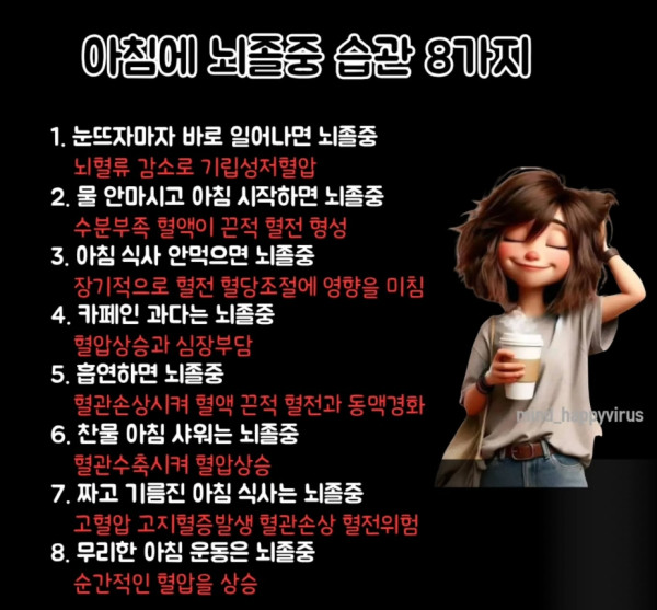 아침 습관 하나가 하루가 아니라 평생을 바꿀 수도 있습니다. 작성자 정보 승승장구쪽지보내기 자기소개 아이디로 검색 전체게시물쪽지보내기 자기소개 아이디로 검색 전체게시물 작성 작성일 2025.12.16 19:46 컨텐츠 정보 9 조회 목록 본문 게시판 활동이 적극적이고 지속적이면 레벨업 됩니다. SNS 공유 신고 승승장구쪽지보내기 자기소개 아이디로 검색 전체게시물쪽지보내기 자기소개 아이디로 검색 전체게시물 레벨 96 100% 등록일 19:51 의사들이 경고한 치명적인 습관 10가지 댓글 1 등록일 19:50 그때 투자했다면 지금은 인생이 달라졌을지도~~ 등록일 19:48 조용해 보인다고 모르는 게 아니다. 진짜는 말보다 관찰하고 움직인다. 등록일 19:47 정상들의 과거 직업을 보면 인생은 정말 어디로 흘러갈지 모릅니다. 관련자료 댓글 0 등록된 댓글이 없습니다. 로그인한 회원만 댓글 등록이 가능합니다. 목록