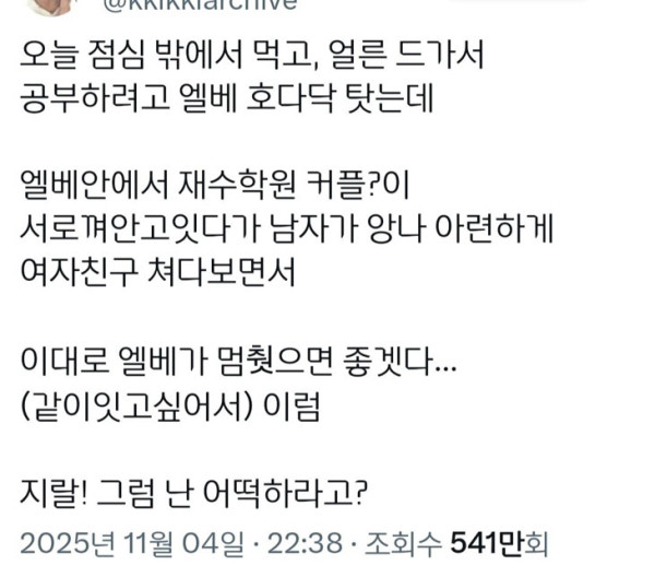 그럼 난? 작성자 정보 데굴데굴쪽지보내기 자기소개 아이디로 검색 전체게시물쪽지보내기 자기소개 아이디로 검색 전체게시물 작성 작성일 2025.12.18 23:45 컨텐츠 정보 12 조회 1 댓글 목록 본문 게시판 활동이 적극적이고 지속적이면 레벨업 됩니다. [펌] SNS 공유 신고 데굴데굴쪽지보내기 자기소개 아이디로 검색 전체게시물쪽지보내기 자기소개 아이디로 검색 전체게시물 레벨 90 99% 등록일 12.18 죽는게 무섭다는 사람 댓글 1 등록일 12.18 동물원의 코요태들 댓글 1 등록일 12.18 그럼 난? 댓글 1 등록일 12.18 도대체 뭘 씻기는 거냐? 댓글 1 관련자료 댓글 1 데굴데굴님의 댓글 데굴데굴쪽지보내기 자기소개 아이디로 검색 전체게시물쪽지보내기 자기소개 아이디로 검색 전체게시물 작성일 12.18 23:47 엘베가 멈췄으면 좋겠다니...엘베에 같이 탄 옆사람은 무슨죄야...^^ㅋㅋㅋ 신고 엘베가 멈췄으면 좋겠다니...엘베에 같이 탄 옆사람은 무슨죄야...^^ㅋㅋㅋ 로그인한 회원만 댓글 등록이 가능합니다. 목록
