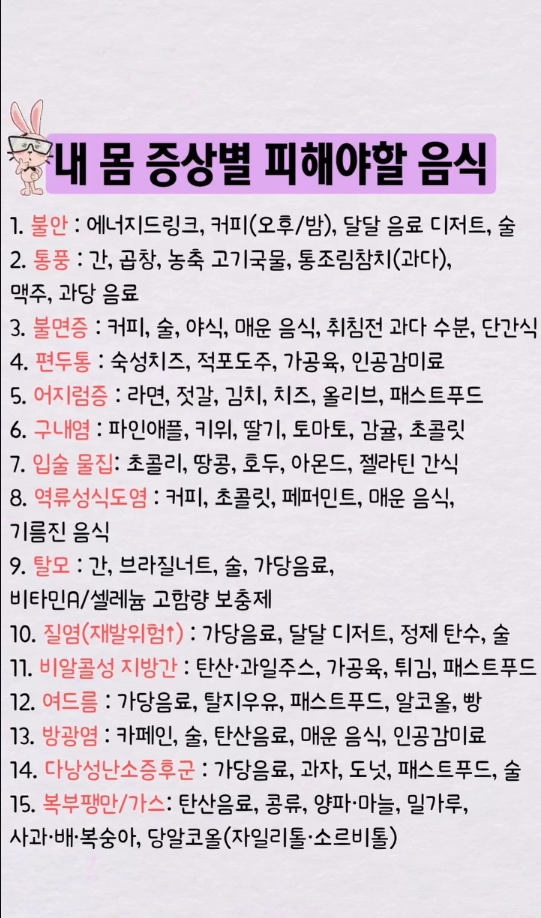 내 몸 증상별 피해야할 음식!!! 작성자 정보 승승장구쪽지보내기 자기소개 아이디로 검색 전체게시물쪽지보내기 자기소개 아이디로 검색 전체게시물 작성 작성일 2025.12.24 01:19 컨텐츠 정보 13 조회 1 댓글 0 추천 목록 본문 . 0 추천 SNS 공유 신고 승승장구쪽지보내기 자기소개 아이디로 검색 전체게시물쪽지보내기 자기소개 아이디로 검색 전체게시물 레벨 96 100% 등록일 01:19 내 몸 증상별 피해야할 음식!!! 댓글 1 등록일 12.23 대한민국 32강 진출 시 만나는 상대 및 장소(국가) 등록일 12.22 대부분의 장기는 조용히 망가집니다.통증은 마지막에 옵니다. 등록일 12.21 울버햄튼, PL 역사상 리그 시작 후 최다 무승 공동 1위 관련자료 댓글 1 짠이야님의 댓글 짠이야쪽지보내기 메일보내기 자기소개 아이디로 검색 전체게시물쪽지보내기 메일보내기 자기소개 아이디로 검색 전체게시물 작성일 02:27 음.. 다 피해야할 판이네 신고 음.. 다 피해야할 판이네 로그인한 회원만 댓글 등록이 가능합니다. 목록