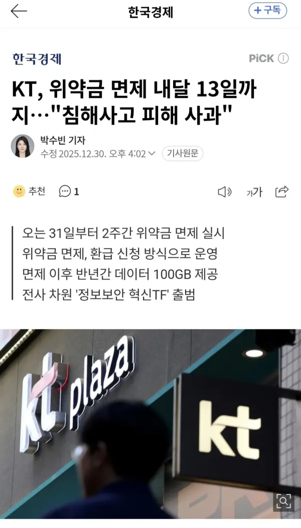 KT 개인정보 유출로 전고객 위약금 면제 작성자 정보 012oppaㅡ문스타쪽지보내기 자기소개 아이디로 검색 전체게시물쪽지보내기 자기소개 아이디로 검색 전체게시물 작성 작성일 2026.01.13 10:20 컨텐츠 정보 18 조회 1 댓글 0 추천 목록 본문 d 0 추천 SNS 공유 신고 012oppaㅡ문스타쪽지보내기 자기소개 아이디로 검색 전체게시물쪽지보내기 자기소개 아이디로 검색 전체게시물 레벨 96 100% 등록일 10:20 KT 개인정보 유출로 전고객 위약금 면제 댓글 1 등록일 01.12 한국인이 외국나가면 제일 조심해야되는 사람 댓글 1 등록일 01.11 지극히 현실적인 2030 청년 현실 댓글 1 등록일 01.10 “차에 똥싸는 표시가 떴어요” 댓글 2 관련자료 댓글 1 012oppaㅡ문스타님의 댓글 012oppaㅡ문스타쪽지보내기 자기소개 아이디로 검색 전체게시물쪽지보내기 자기소개 아이디로 검색 전체게시물 작성일 10:21 9월 이전 약정 가입자 대상으로 위약금 면제 선청구 후 면제 방식 신고 9월 이전 약정 가입자 대상으로 위약금 면제 선청구 후 면제 방식 로그인한 회원만 댓글 등록이 가능합니다. 목록