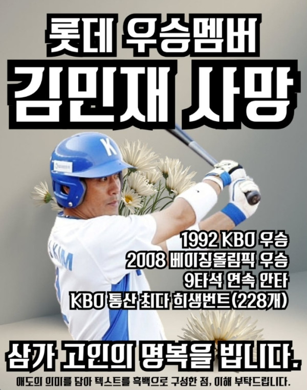 김민재 롯데 코치가 암투병 끝에 14일 오후 별세하셨습니다. 향년 53세. 작성자 정보 승승장구쪽지보내기 자기소개 아이디로 검색 전체게시물쪽지보내기 자기소개 아이디로 검색 전체게시물 작성 작성일 2026.01.14 15:50 컨텐츠 정보 9 조회 0 추천 목록 본문 . 0 추천 SNS 공유 신고 승승장구쪽지보내기 자기소개 아이디로 검색 전체게시물쪽지보내기 자기소개 아이디로 검색 전체게시물 레벨 96 100% 등록일 15:50 김민재 롯데 코치가 암투병 끝에 14일 오후 별세하셨습니다. 향년 53세. 등록일 12:30 무궁화꽃을 모티브로 한 이번 2026 월드컵 원정 유니폼 디자인이 유출되었습니다. 등록일 01.13 2025년 대한민국 유튜버 수익 TOP 10 대공개! 등록일 01.13 화려한 스타들에게도 피치 못할 사정이? '군 면제' 스타 10인의 사유를 정리했습니다! 관련자료 댓글 0 등록된 댓글이 없습니다. 로그인한 회원만 댓글 등록이 가능합니다. 목록