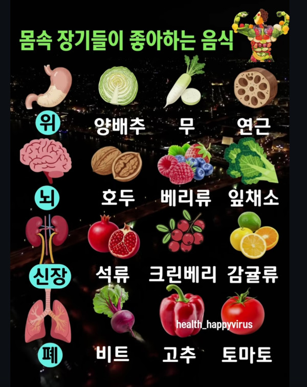 몸속 장기들이 좋아하는 음식! 작성자 정보 승승장구쪽지보내기 자기소개 아이디로 검색 전체게시물쪽지보내기 자기소개 아이디로 검색 전체게시물 작성 작성일 2026.01.17 12:07 컨텐츠 정보 18 조회 0 추천 목록 본문 . 0 추천 SNS 공유 신고 승승장구쪽지보내기 자기소개 아이디로 검색 전체게시물쪽지보내기 자기소개 아이디로 검색 전체게시물 레벨 96 100% 등록일 12:07 몸속 장기들이 좋아하는 음식! 등록일 01.16 세계 평균 월급 TOP 15 댓글 1 등록일 01.15 김민재, 시즌 첫 골! 오늘 쾰른전에서 이토 히로키의 크로스를 헤더로 마무리하며 역전골 기록 댓글 3 등록일 01.14 김민재 롯데 코치가 암투병 끝에 14일 오후 별세하셨습니다. 향년 53세. 댓글 1 관련자료 댓글 0 등록된 댓글이 없습니다. 로그인한 회원만 댓글 등록이 가능합니다. 목록