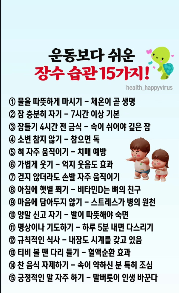 운동보다 쉬운 장수습관15가지 작성자 정보 승승장구쪽지보내기 자기소개 아이디로 검색 전체게시물쪽지보내기 자기소개 아이디로 검색 전체게시물 작성 작성일 2026.01.24 08:09 컨텐츠 정보 32 조회 2 댓글 0 추천 목록 본문 . 0 추천 SNS 공유 신고 승승장구쪽지보내기 자기소개 아이디로 검색 전체게시물쪽지보내기 자기소개 아이디로 검색 전체게시물 레벨 96 100% 등록일 08:09 운동보다 쉬운 장수습관15가지 댓글 2 등록일 01.22 날씨도 추운데 국밥 한그릇 ! 전국 국밥 성지 20곳 댓글 5 등록일 01.21 발이 알려주는 건강신호! 댓글 2 등록일 01.20 사실은 국산 브랜드 TOP 10 댓글 1 관련자료 댓글 2 발야구님의 댓글 발야구쪽지보내기 자기소개 아이디로 검색 전체게시물쪽지보내기 자기소개 아이디로 검색 전체게시물 작성일 08:26 오래 살기 어렵지 않네요~~ 신고 오래 살기 어렵지 않네요~~ 유유미님의 댓글 유유미쪽지보내기 메일보내기 자기소개 아이디로 검색 전체게시물쪽지보내기 메일보내기 자기소개 아이디로 검색 전체게시물 작성일 10:41 하루에 자주해야하는 습관이네 신고 하루에 자주해야하는 습관이네 로그인한 회원만 댓글 등록이 가능합니다. 목록