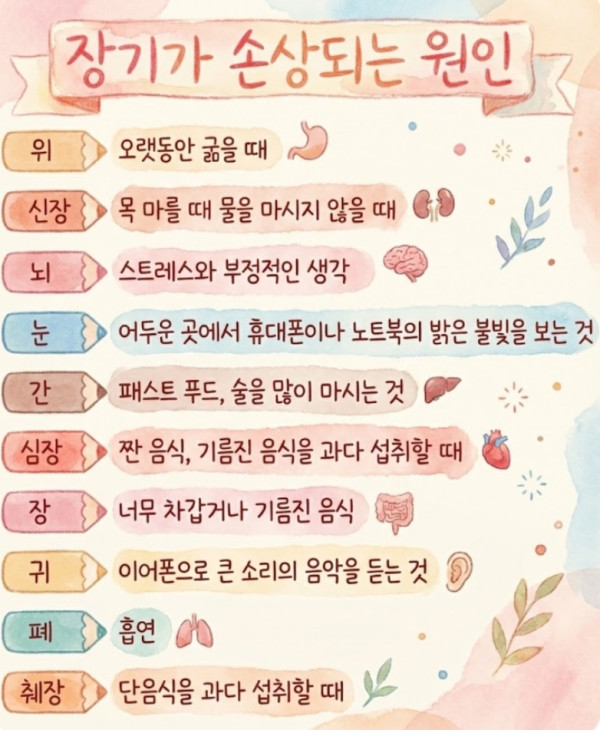 장기가 손상되는 원인 작성자 정보 승승장구쪽지보내기 자기소개 아이디로 검색 전체게시물쪽지보내기 자기소개 아이디로 검색 전체게시물 작성 작성일 2026.02.04 09:43 컨텐츠 정보 4 조회 0 추천 목록 본문 . 0 추천 SNS 공유 신고 승승장구쪽지보내기 자기소개 아이디로 검색 전체게시물쪽지보내기 자기소개 아이디로 검색 전체게시물 레벨 96 100% 등록일 09:43 장기가 손상되는 원인 등록일 2026.01.30 증상별 손 혈자리 댓글 4 등록일 2026.01.29 몸속 장기들이 가장 싫어하는 음식들 댓글 4 등록일 2026.01.28 성질 더러운 성씨 순위! 재미로 보자구요! 댓글 7 관련자료 댓글 0 등록된 댓글이 없습니다. 로그인한 회원만 댓글 등록이 가능합니다. 목록