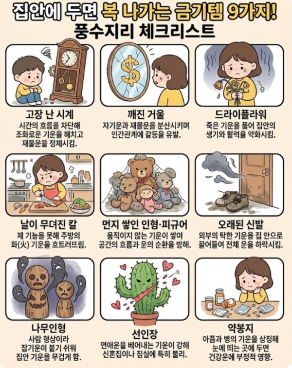 집안에 두면 복 나가는 금기템 9가지 작성자 정보 승승장구쪽지보내기 자기소개 아이디로 검색 전체게시물쪽지보내기 자기소개 아이디로 검색 전체게시물 작성 작성일 2026.02.06 09:00 컨텐츠 정보 10 조회 0 추천 목록 본문 . 0 추천 SNS 공유 신고 승승장구쪽지보내기 자기소개 아이디로 검색 전체게시물쪽지보내기 자기소개 아이디로 검색 전체게시물 레벨 96 100% 등록일 09:00 집안에 두면 복 나가는 금기템 9가지 등록일 02.05 절대 건드리면 안되는 10가지 댓글 3 등록일 02.04 장기가 손상되는 원인 댓글 1 등록일 2026.01.30 증상별 손 혈자리 댓글 4 관련자료 댓글 0 등록된 댓글이 없습니다. 로그인한 회원만 댓글 등록이 가능합니다. 목록