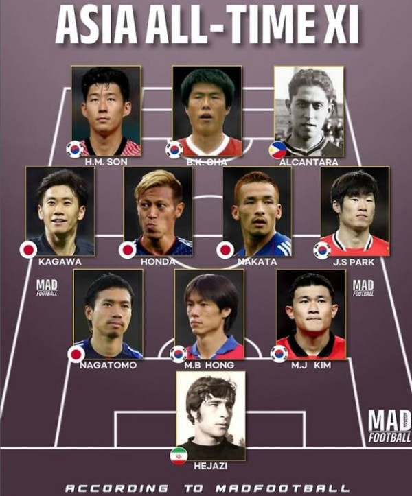 아시아 역대 BEST 11 손흥민, 차법근, 박지성, 홍명보, 김민재 5명 이름 올라. 한편 일본은 4명