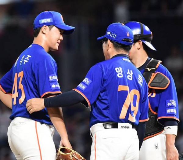- 정우주는 마운드를 내려가며 양상문 코치의 칭찬 을 받았다.