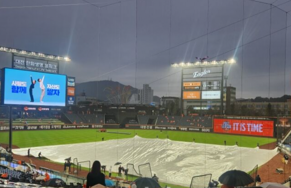 한화 이글스가 7년 만에 대전 한화생명볼파크에서 치르는 가을야구 경기가 비로 인해 불확실한 상황에 놓였다. 2018년 10월 이후 2554일 만에 열리는 이 중요한 경기를 앞두고, 경기장에는 대형 방수포가 설치됐다.